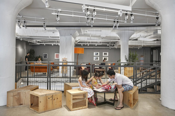 注重復(fù)古和手工藝品的Etsy總部,自然要體現(xiàn)這一獨(dú)特元素的設(shè)計(jì)和運(yùn)用,室內(nèi)大量的藝術(shù)品、裝飾品和家具都來(lái)自當(dāng)?shù)氐乃囆g(shù)家以及Etsy的網(wǎng)店賣家。入口處手工制作的大型吊燈更是令時(shí)尚辦公網(wǎng)的小伙伴們驚艷。在Etsy總部沒有華麗的材料堆砌,只有隨處可見的藝術(shù)品、墻面壁畫、充滿創(chuàng)意的手工藝品、有趣的裝飾品,還有生機(jī)勃勃的綠色植物。