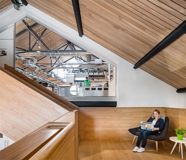 辦公室內(nèi)有29個鄰里單位,大型公共桌子取代了個人辦公桌。這些區(qū)域內(nèi)還包括了個人儲藏空間,一個或兩個高凳站立區(qū)域,以及一個沙發(fā)位。中心樓梯成為辦公室里的聚焦點(diǎn)。樓梯以“廣場”為名,把二層和地面層連接起來,使各樓層空間融為一體。多功能的樓梯能滿足多種用途,從能容納多達(dá)400人的會議和社區(qū)活動空間,到工作環(huán)境里的休息風(fēng)格空間。