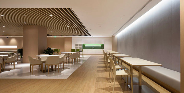 新的辦公中心非常注重員工的休閑空間的設(shè)置,西側(cè)挑空層設(shè)置了大型員工書(shū)吧 及休閑區(qū)域。