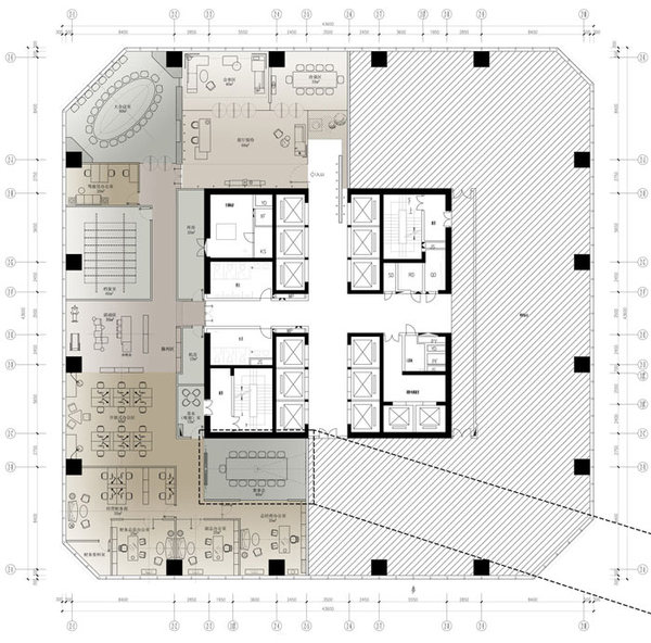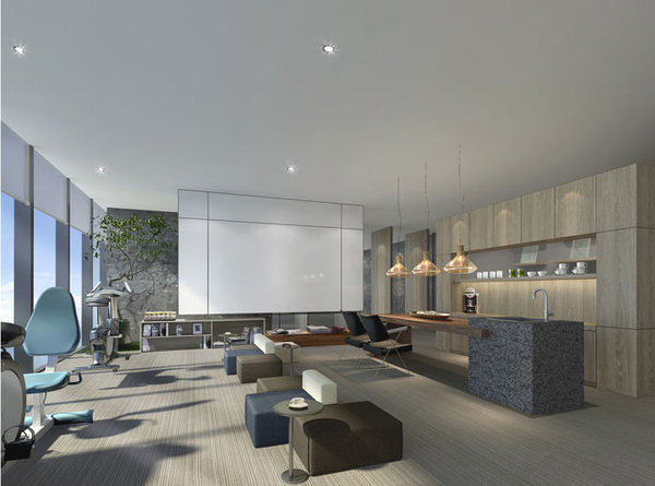 辦公區(qū)域的設(shè)計:設(shè)計師在設(shè)計的時候,將其裕休息區(qū)域、交流區(qū)域融合在一起,設(shè)計師希望員工在精神壓力巨大的時候,可以坐在此地俯視外界的風(fēng)景,使自己的壓力得到釋放,俯視可以起到很好的轉(zhuǎn)化作用,同時員工之間的相互交流可以很好的加深員工之間的友誼。