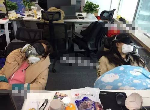 中午午休時間,兩名女員甚至戴著這種防毒面具,在座位上睡覺。記者發(fā)現(xiàn),戴有類似防毒面具的員工不下10人。