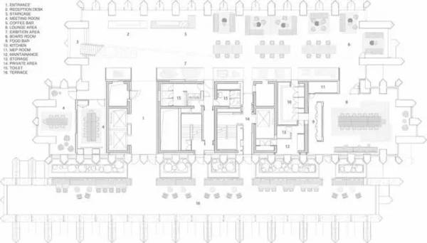 室內(nèi)和室外同時(shí)使用了簡化的米黃色的石材,作為對于外灘老上海建筑的一種追溯,還使用仿佛能把人帶入未來的簡潔而堅(jiān)硬的白色墻面。此外還有許多的小細(xì)節(jié):電梯廳附近45度的傾角;奶油色的石材使得空間看上去更加開闊;明亮的光照,在上海的古老和現(xiàn)代之間尋找到平衡。