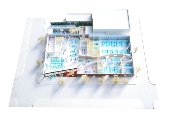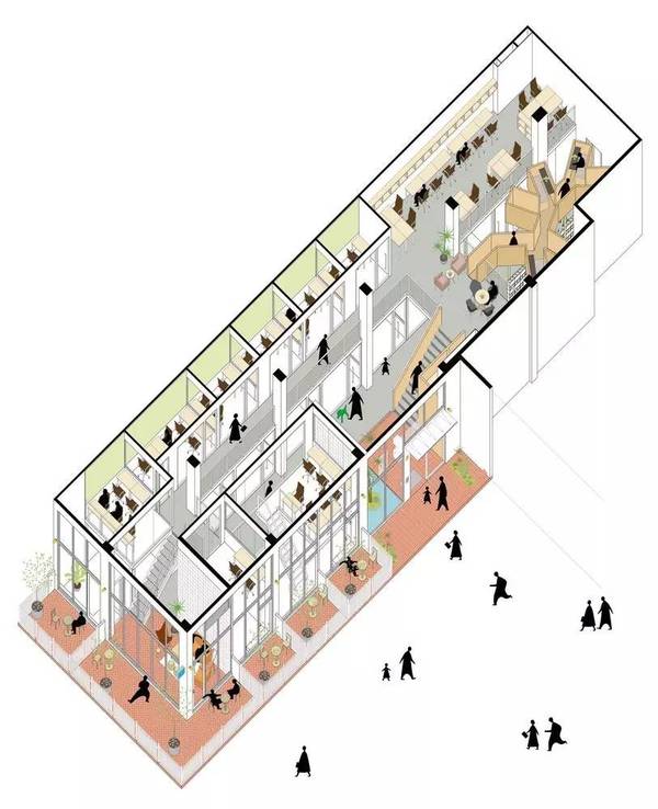 這樣的設(shè)計(jì)手法,給予室內(nèi)空間相互關(guān)聯(lián)。同時(shí),設(shè)計(jì)者還對(duì)建筑入口進(jìn)行了從視覺(jué)化的處理,移除面向西南角的三角形的區(qū)域,改為透明的立面,將被涂鴉的磚墻重新組裝,以制造出不同的涂鴉樣式,以此表現(xiàn)建筑以及社區(qū)間層層疊加以及穿插的歷史。