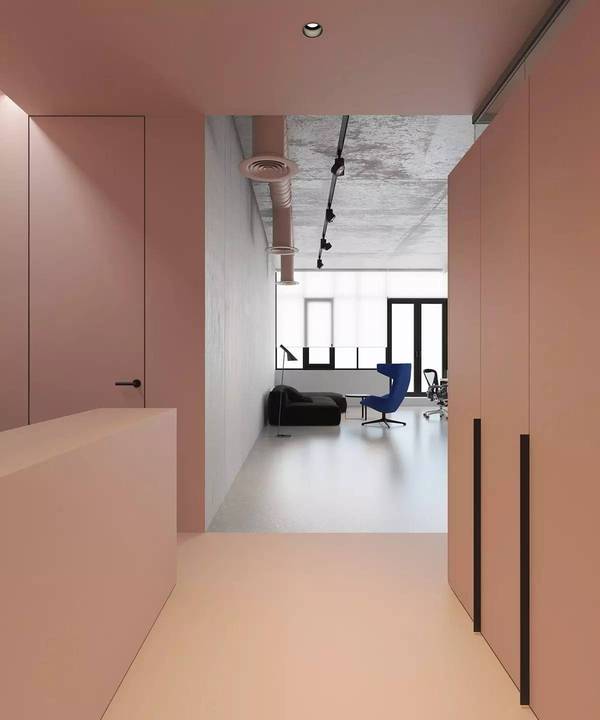外露的鋼管也被粉刷成粉色,整個(gè)空間采用混凝土鋪陳,從地面延伸至墻面,天花,統(tǒng)一的材質(zhì)讓空間變得簡(jiǎn)潔,干凈,中央擺放著一張長(zhǎng)條形的巨型辦公桌,通過(guò)淡色木質(zhì)面板以及黑色鐵件塑造出輕盈靈巧的視覺(jué)感受。休息區(qū)用黑色轉(zhuǎn)角沙發(fā)搭配鮮艷的寶藍(lán)色單人椅,帶來(lái)鮮明的對(duì)比。