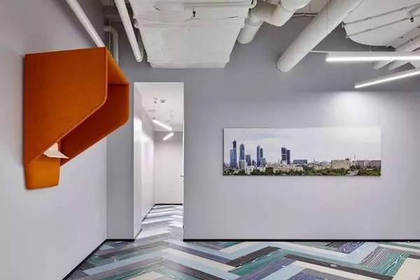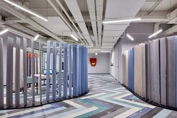 沿墻布局的會議室、辦公室等獨立空間與開放區(qū)域僅由通透的玻璃做隔墻,以保證空間在視覺效果上的連貫和完整性。并且這些獨立空間的頂和墻不做任何其它修飾,只在地面的地毯拼貼上延續(xù)整體的色彩搭配。