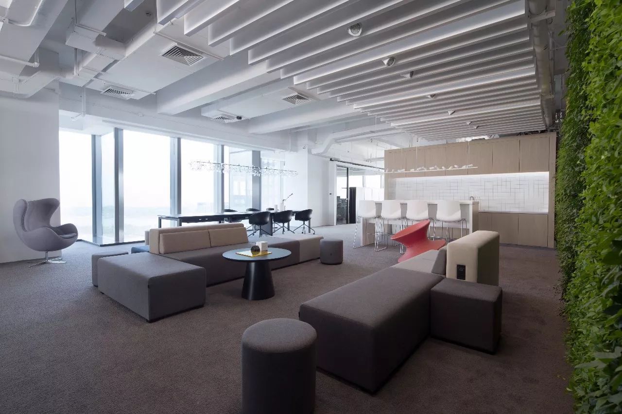 為了弱化傳統(tǒng)辦公室的緊張氛圍,公共休閑區(qū)配置了特別大的面積,包括大面積的垂直綠化墻、廚房及水吧。成為員工聚會(huì)、休息,或工作交流、頭腦風(fēng)暴的聚集地。模塊化的沙發(fā),能實(shí)現(xiàn)多變的組合方式,以及滿足員工360度全方位的無(wú)障礙溝通。