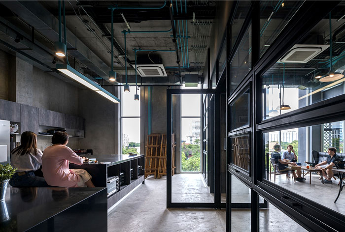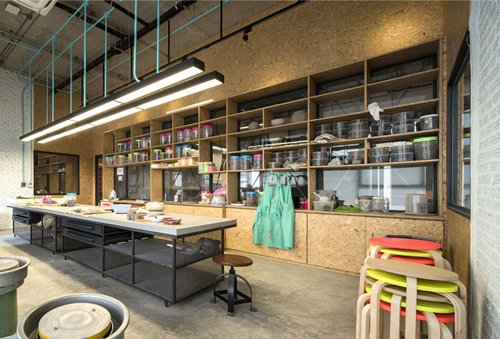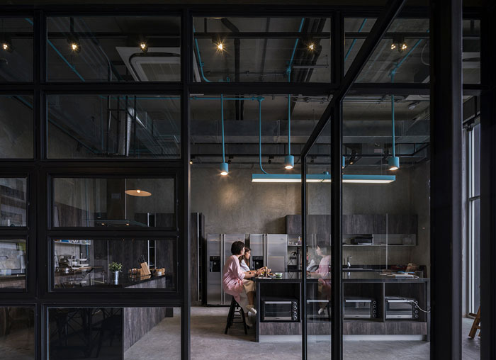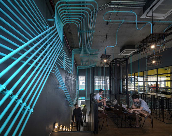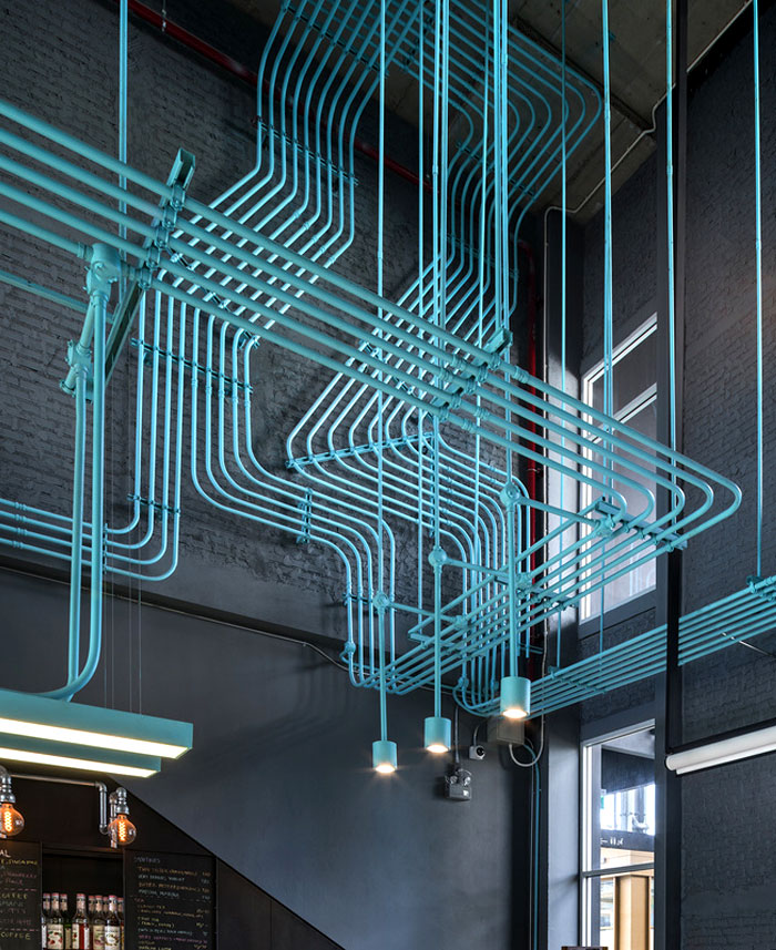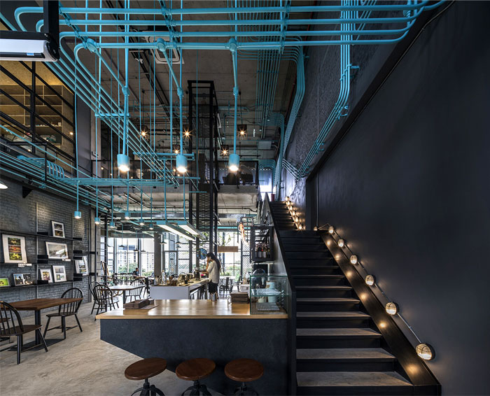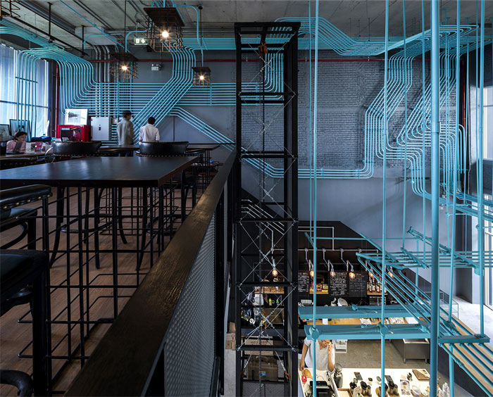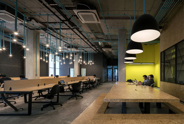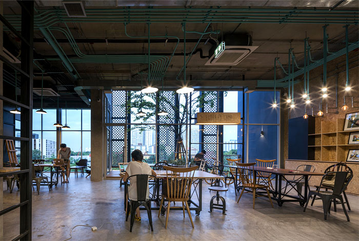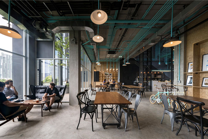整個(gè) Co-Working Space 面積寬敞,以工業(yè)廠房的形式接待著來訪的客人,稍經(jīng)修飾的地面與裸露的混凝土立柱,帶來*為原始、粗獷的空間魅力,一層為咖啡廳,從售賣各種食品的吧臺(tái)到充滿工業(yè)感的桌椅,很難將它與工作空間聯(lián)想到一塊。