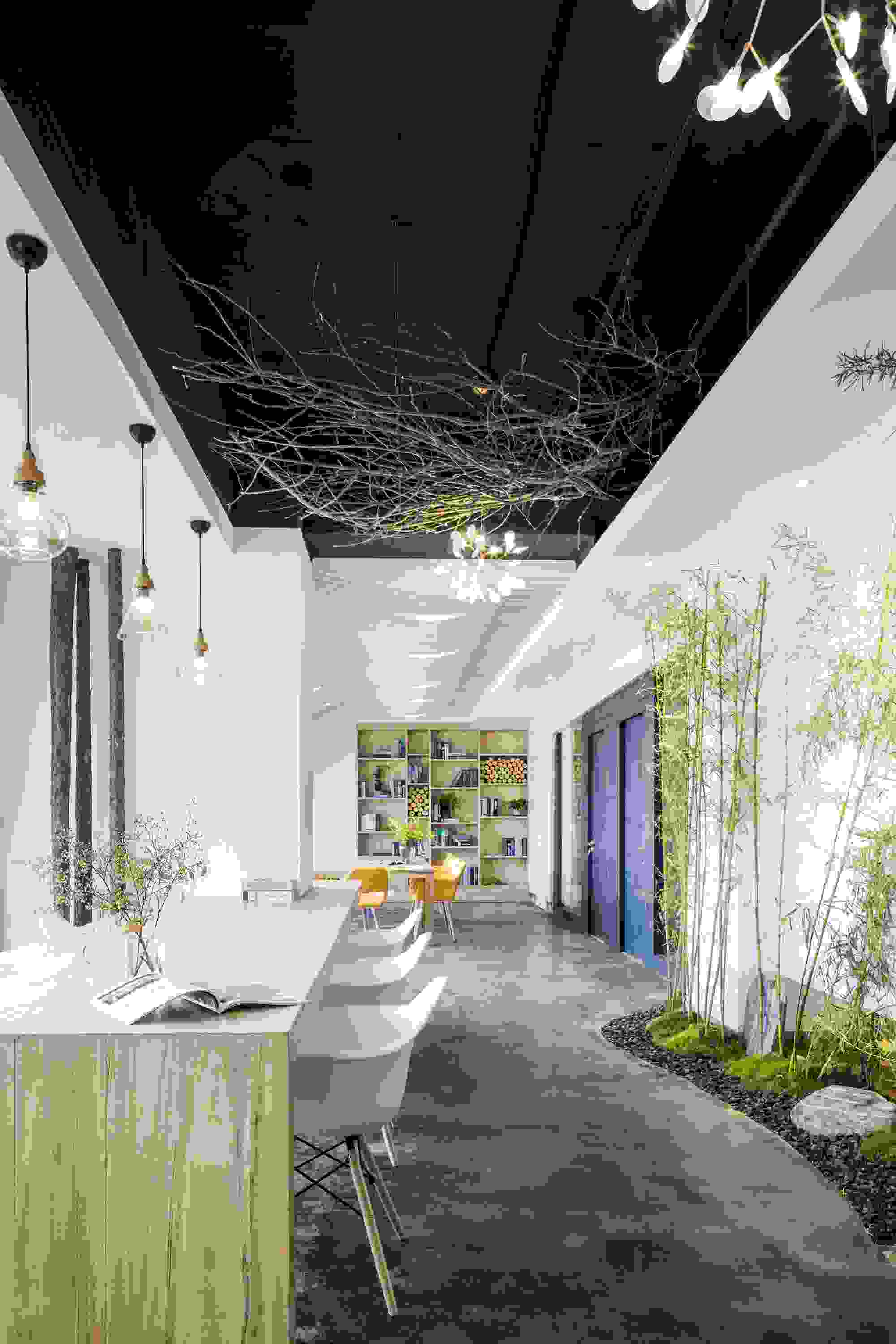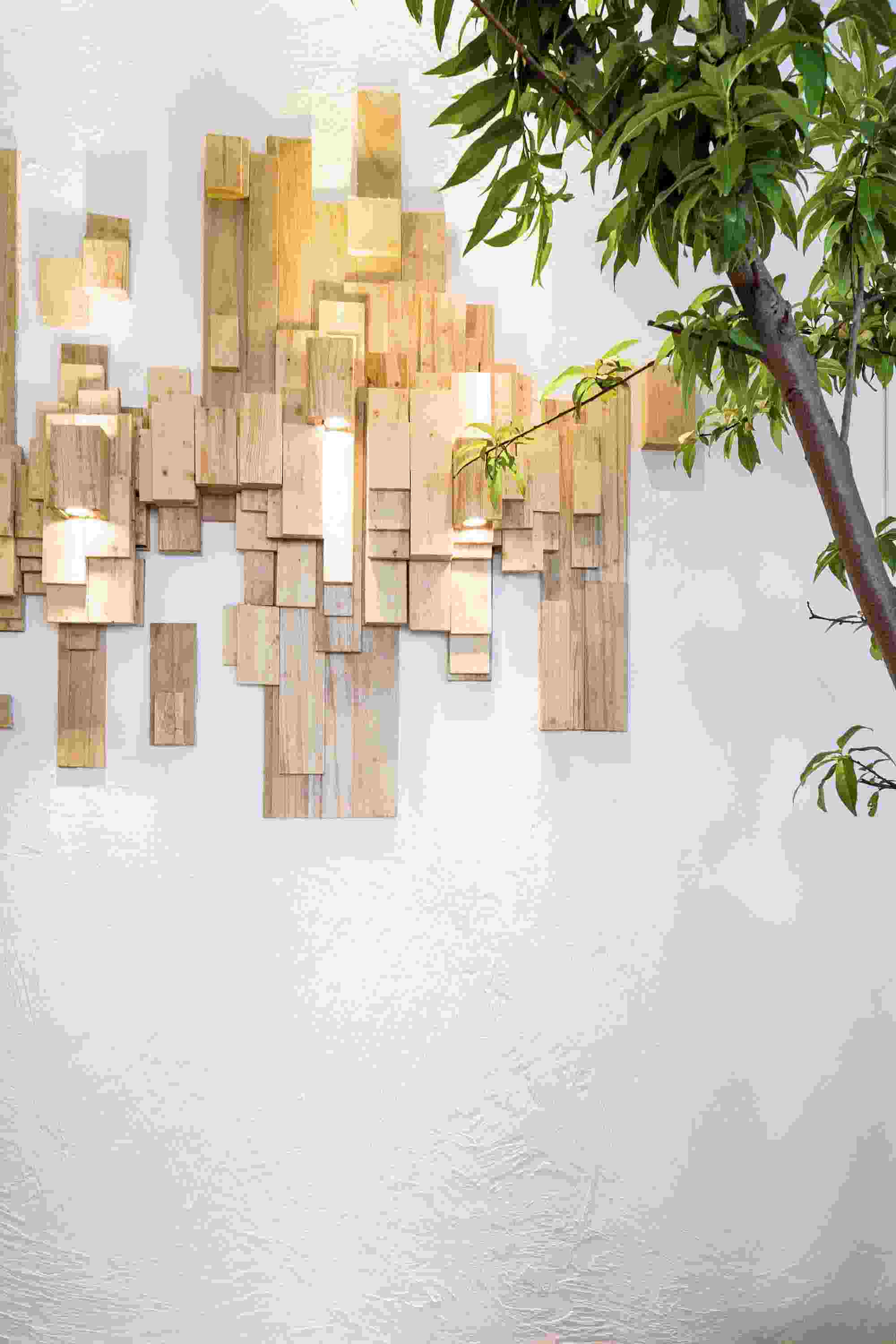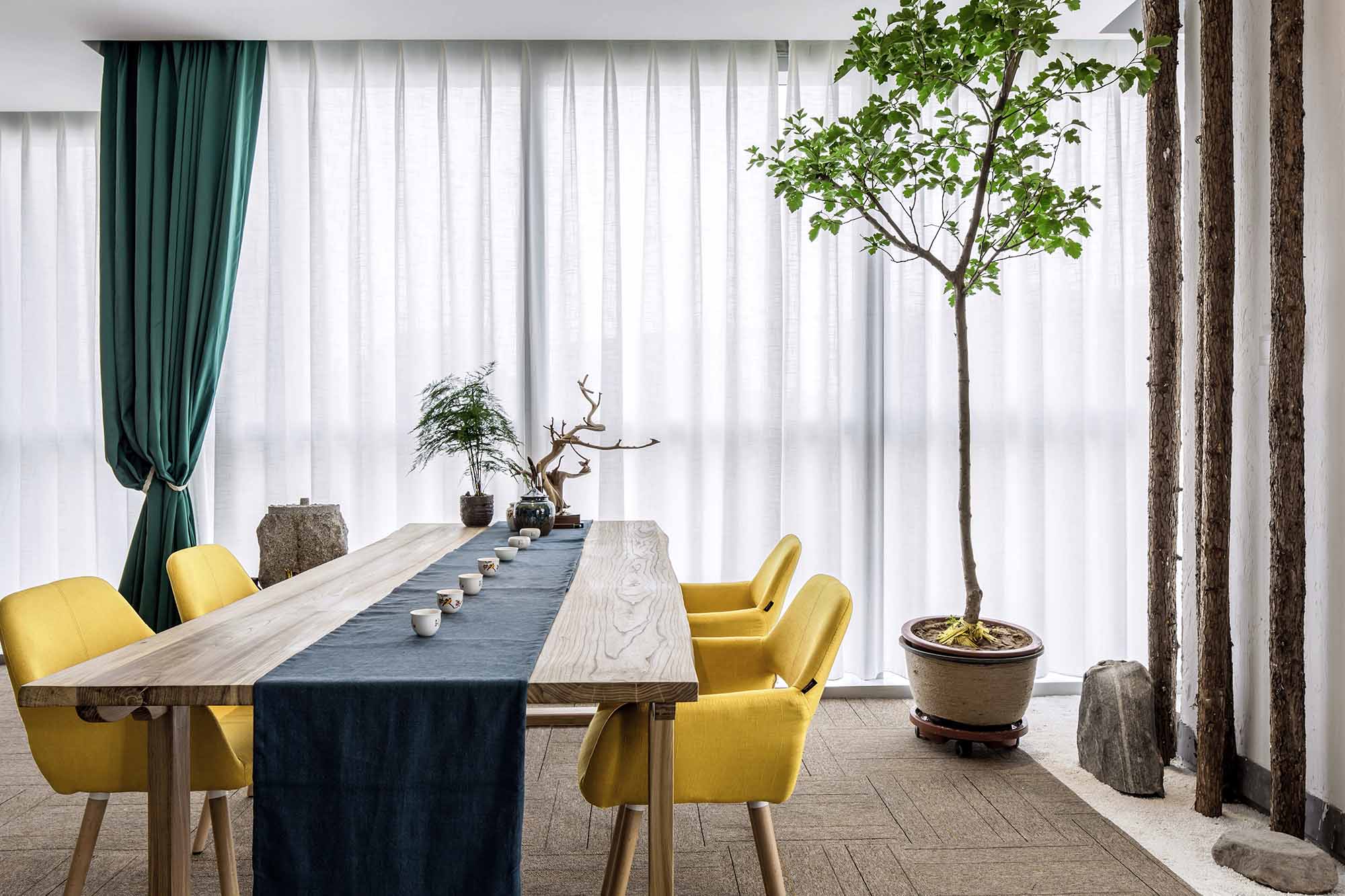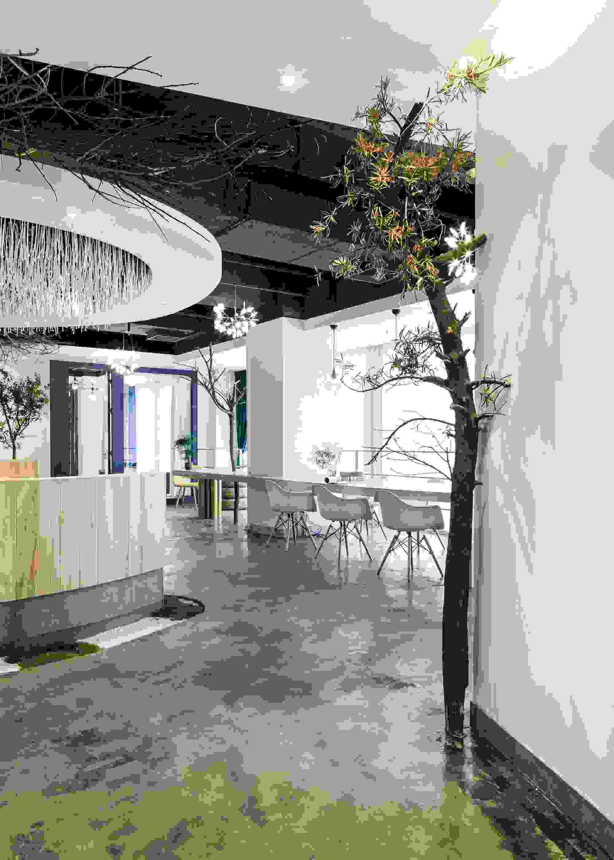 東方的美學向來是含蓄溫婉的,LOGO墻處的玻璃透景配合自然的竹石,隨著太陽的變化,光影也在不斷的變化,猶如人生。在材料的運用上選用的都是一些環(huán)保低碳的天然材料,如樹枝、石竹、枯木、天然原木板,地面則是采用了水泥自流平的方式。