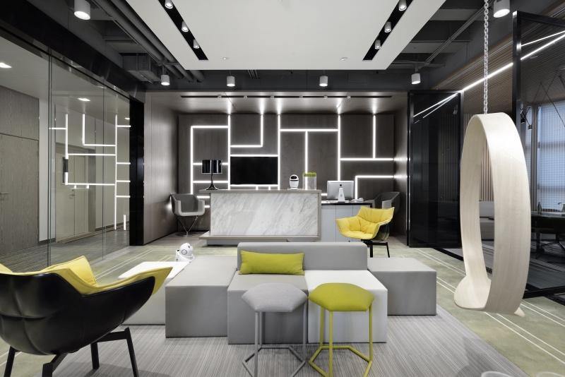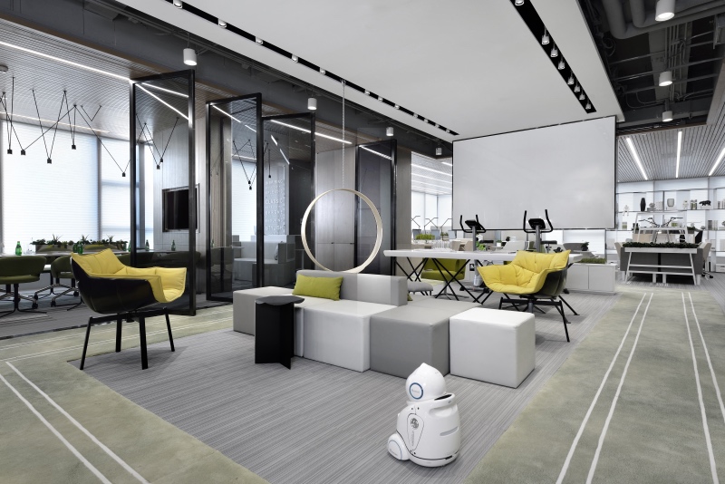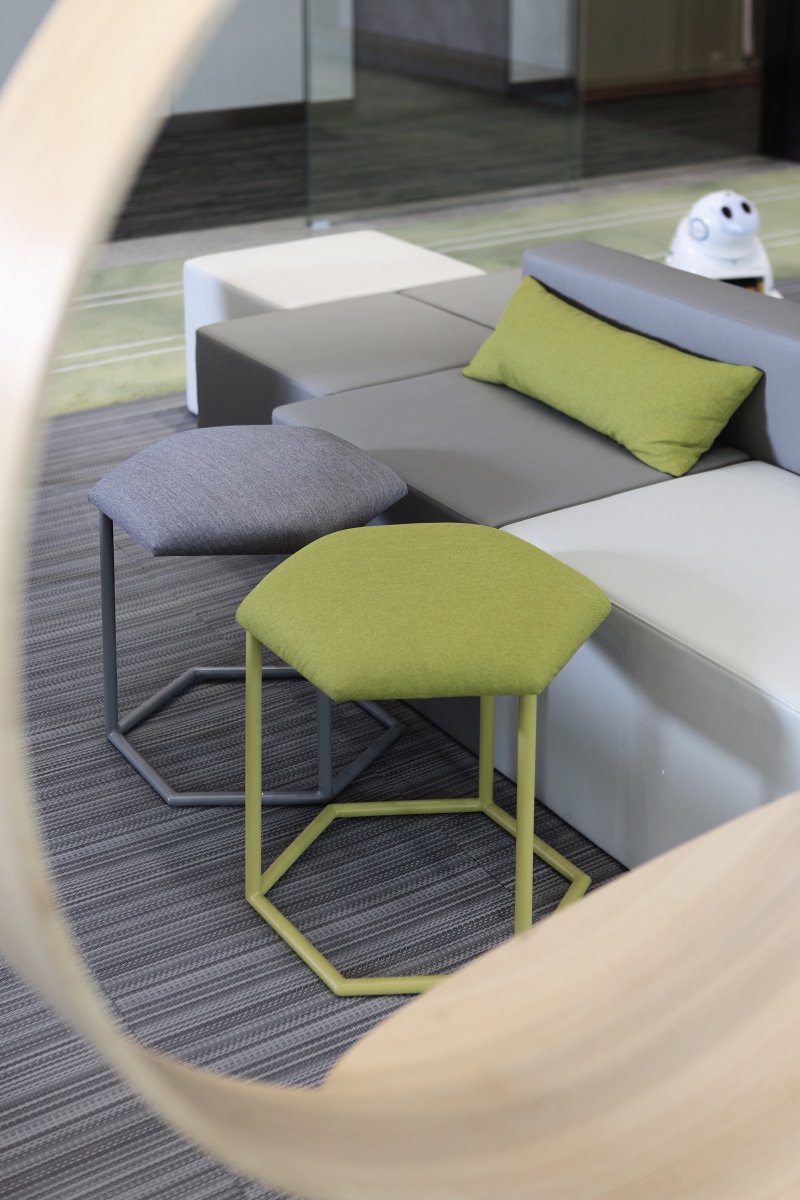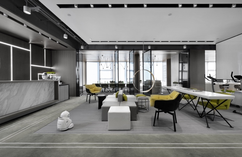 門(mén)廳區(qū)域摒棄傳統(tǒng)冷冰冰的接待形式,由超級(jí)吧臺(tái)、茶歇區(qū)、健康辦公區(qū)、討論區(qū)等功能組合而成,把互聯(lián)網(wǎng)開(kāi)放性思維植入到日常辦公生活中。同時(shí)利用健康跑道地毯將整個(gè)空間串聯(lián)起來(lái),讓空間更加具有活力和生氣。