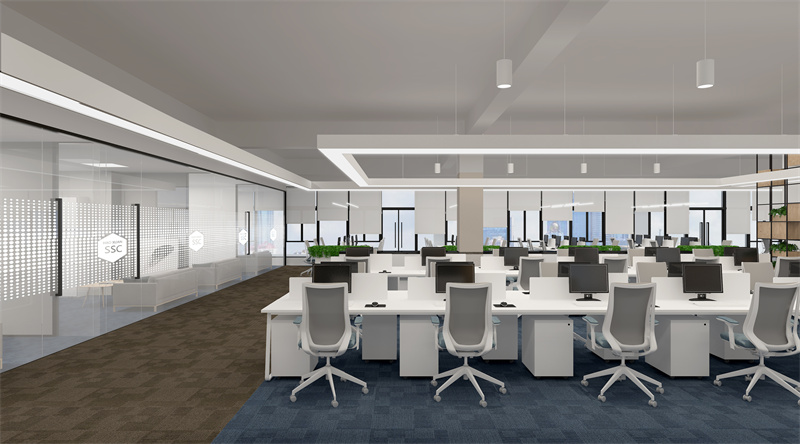 2、其次辦公空間內(nèi)靠近過道的獨(dú)立辦公室,靠近過道的一面盡量使用玻璃隔斷,以玻璃隔斷的通透性為空間視覺帶來更佳寬敞的體驗(yàn)。辦公室內(nèi)天花不宜過低,如果公共辦公區(qū)很大,層高卻不夠高的話,可以在公共辦公區(qū)使用裸頂,過道和其他地方使用吊頂。這樣公共辦公區(qū)與過道天花的對(duì)比不僅能清晰的劃分公共辦公區(qū)的空間,也能夠使空間垂直延伸感增強(qiáng),使人在視覺感處上更加舒適。