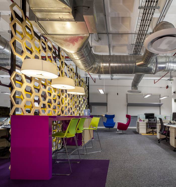 LOFT風(fēng)格辦公區(qū)域很多使用新穎獨特的隔屏設(shè)計,有利于員工之間的相互溝通,又能避免相互干擾。整個空間大面積的引入自然光線,并且配置圖書室與咖啡室,加以主色調(diào)及其穿插于整個空間,營造出了一個親切、陽光、活力的工作氛圍。